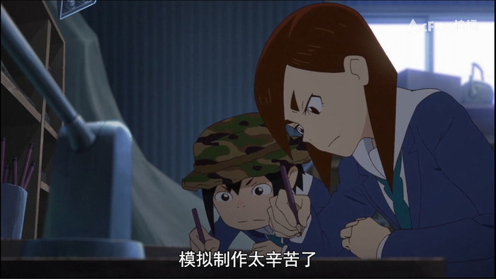 但最关键的,是努力。最近几年,日本动画产业从业者的日子并不好过。且不说去年“京阿尼火灾”这样的飞来横祸。资金的紧缺,早已促使各动画工作室不断通过服务外包等形式压缩制作成本,降低制作者的薪酬待遇,使其从原本的创意制造者退化为机械熟练工。这一现实在《别对映像研出手!》中同样有所映射——仅仅5分钟的彩色动画就需要3600张原画,这一工作量竟然需要水崎燕与浅草绿必须24小时工作连续50天才能完成!过度的劳动,不但使得画师的手指缠满了绷带,还迫使其夜以继日的工作……“模拟制作太辛苦了”,这不但是动画片中人物的台词,恐怕也是《别对映像研出手!》动画制作者的心声。