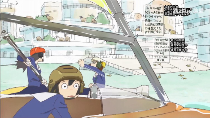 到了《别对映像研出手!》里面,汤浅政明的想象力又一次得到了充分展示。原本“思考”这一头脑活动是私人化、概念化的东西,很难加以直接解释。但汤浅政明仍然有能力将这一“概念”化为“实物”。在《别对映像研出手!》里,观众不但在画面中直接看到了浅草绿在大脑中构思的“动画概念草图”,就连动画片画面本身也直接进入了草图的幻境之中,甚至浅草绿与其他两位女主人公,也化身为这张草图的一部分对观众进行讲解。观众看到她们登上巨大的蜻蜓状飞行器,操作双管炮的坦克,乃至成为巨型机器人的驾驶员……动画里的“现实”世界与动画中的“动画”世界之间界限变得十分模糊,仿佛将《别对映像研出手!》中的整体世界都无限地扩大了。