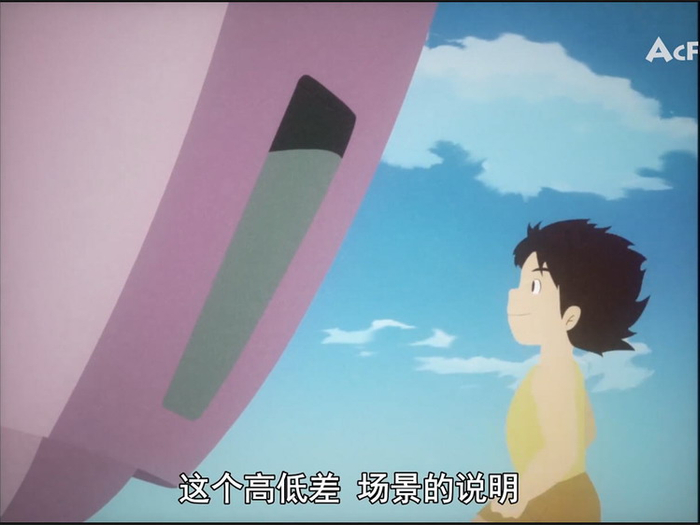 其次,要有技巧。同样是在动画片的开始部分,汤浅政借着浅草绿之口对动画片《孤岛的柯南》的细节大肆赞美。观众也由此得知,诸如高低对比、大小对比、用小物体反衬速度感等这样的表现手法,对营造整部动画片的视觉冲击力会产生怎么样的奇妙效果。