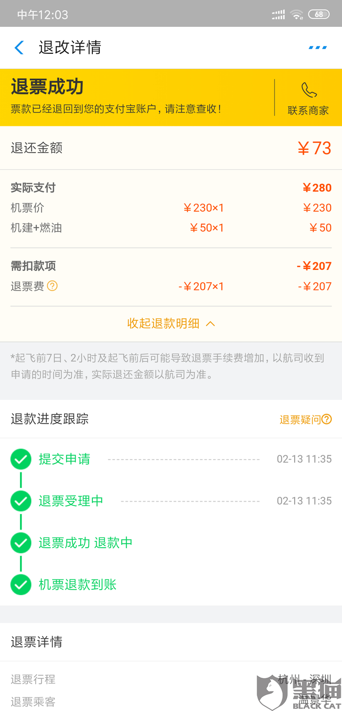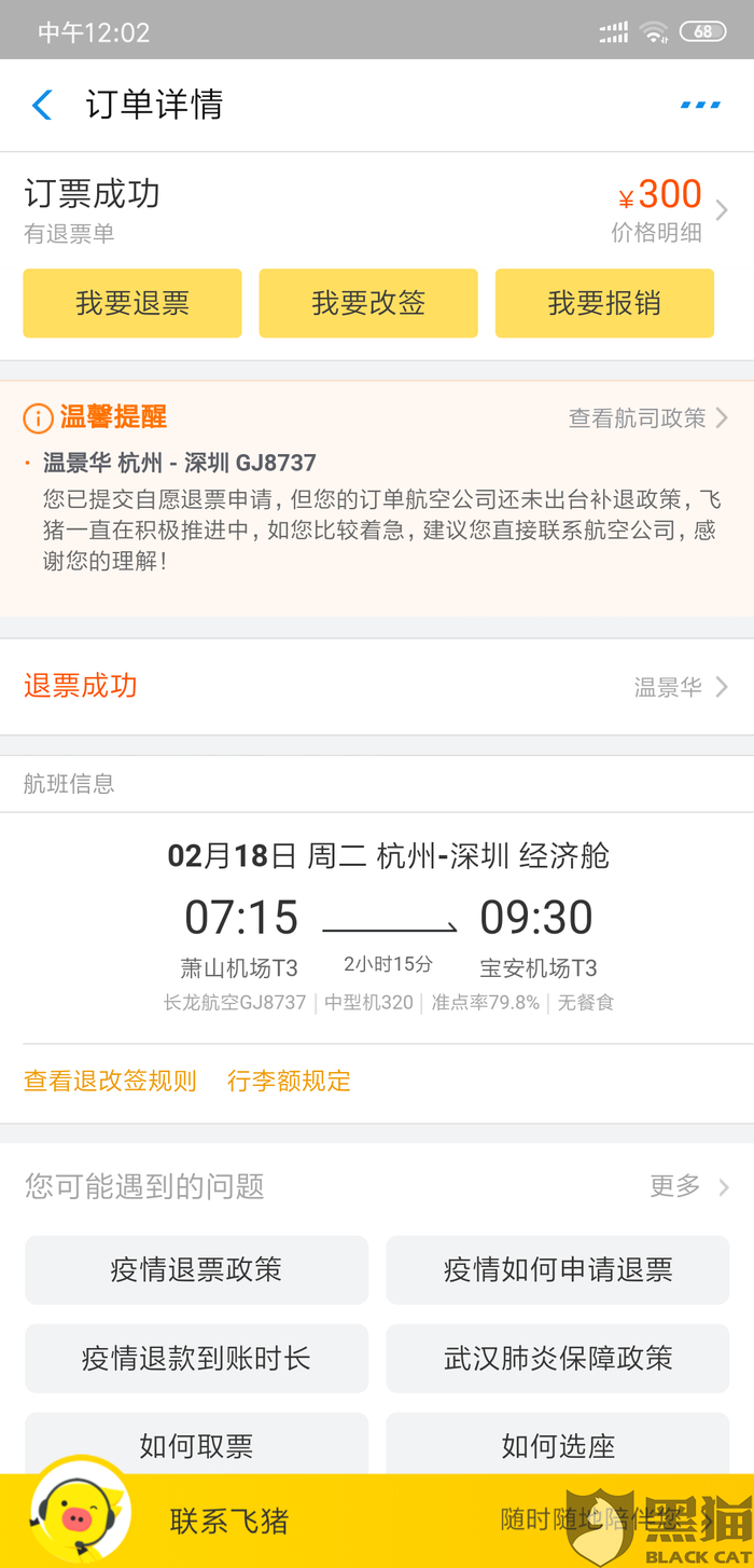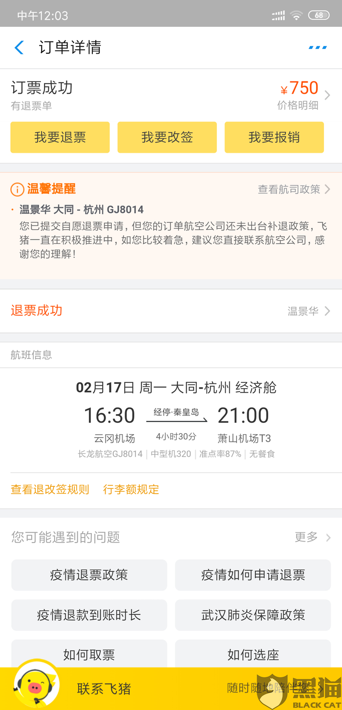 黑猫投诉:1050元买的机票大同到深圳 由于肺炎特殊时期所以只能退票到账211元