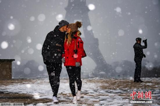 资料图:当地时间1月22日,法国巴黎市中心降下2019年第一场雪。图为一对情侣在埃菲尔铁塔前合影留念。