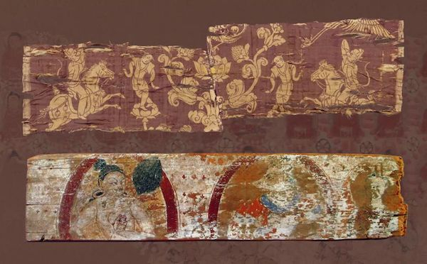 棕地黄色花卉狩猎纹锦(上图) 唐-宋 策勒县达玛沟佛教遗址博物馆藏 “鼠王传说”木板画(下图),出土于丹丹乌里克遗址。
