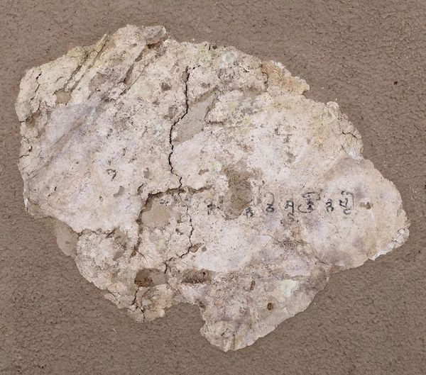出土于托普鲁克墩周边地区的于阗文题记壁画残片,现收藏于策勒县达玛沟佛教遗址博物馆