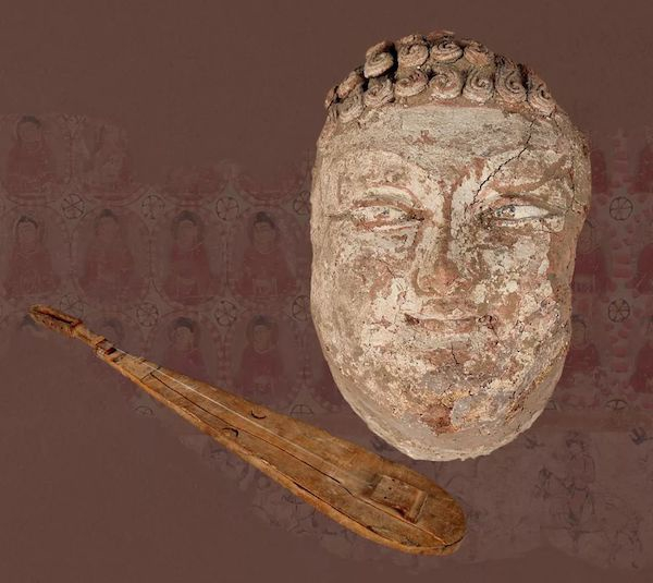 此文物保存相对完好,仅两耳缺损。弯眉,高鼻,小嘴。前后排螺髻的卷曲程度并不规律,极富变化。体现了于阗佛教艺术讲求韵律、富于变化的特征。发掘达玛沟托普鲁克墩2号遗址的过程中,在附近的沙丘里发现了这把三弦琵琶。其面板光滑平整,背部呈拱形,琴头、箱体、覆手尚存,琴头上装置弦轴的六个小孔位置精确、大小统一,但弦轴已丢失。