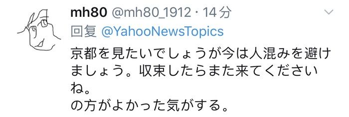 还有人表示,“我觉得这么写会更合适:尽管大家想来京都,但现在还是避开人群吧,等(疫情)结束请再来光临吧。”