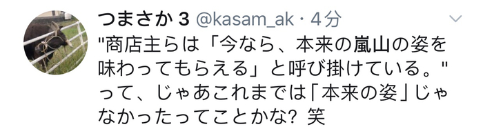 有人针对报道中“店主们呼吁‘如果是现在,可以看到岚山的本来面貌’”的文段提出:“这么说,此前的岚山就不是‘本来面貌’了吗?(笑)”