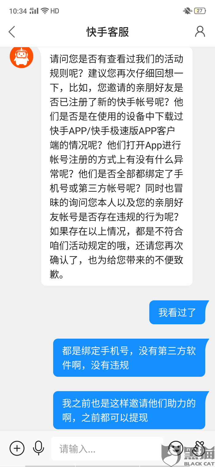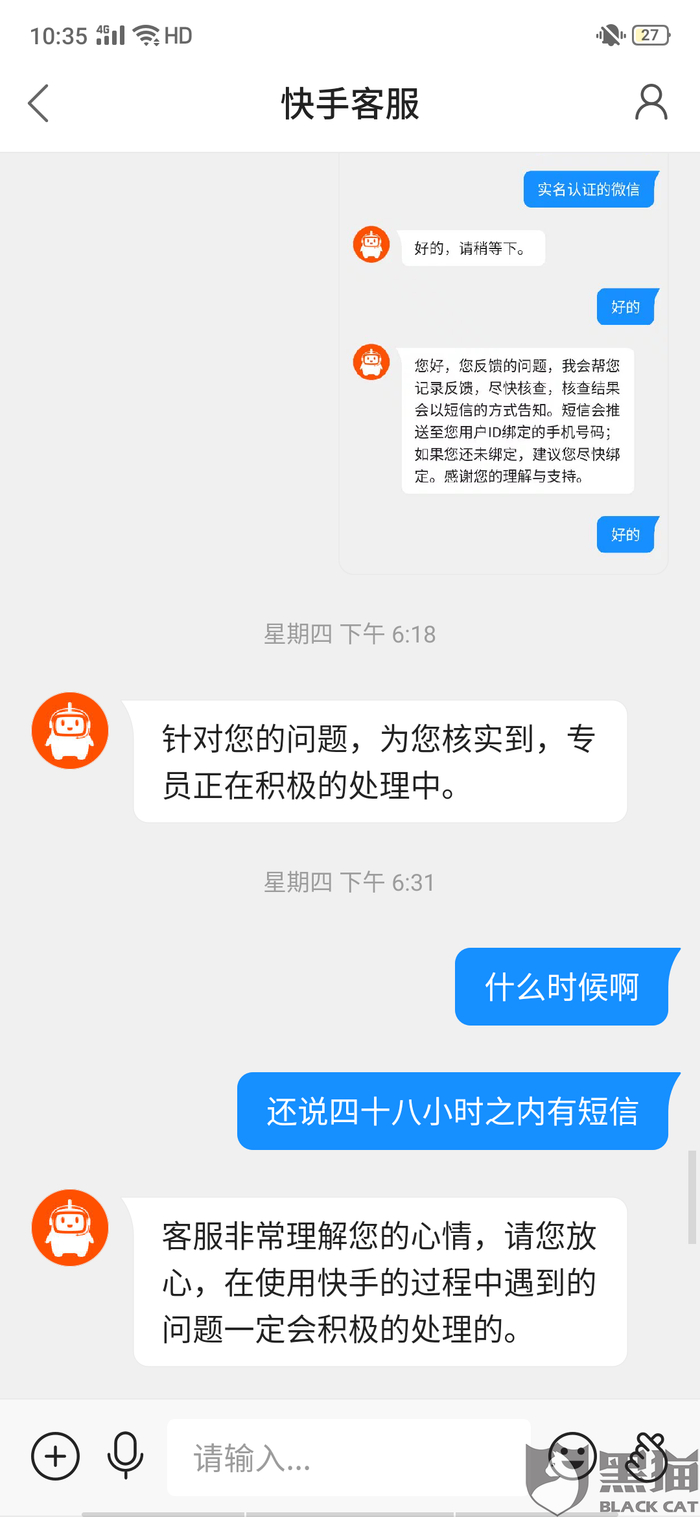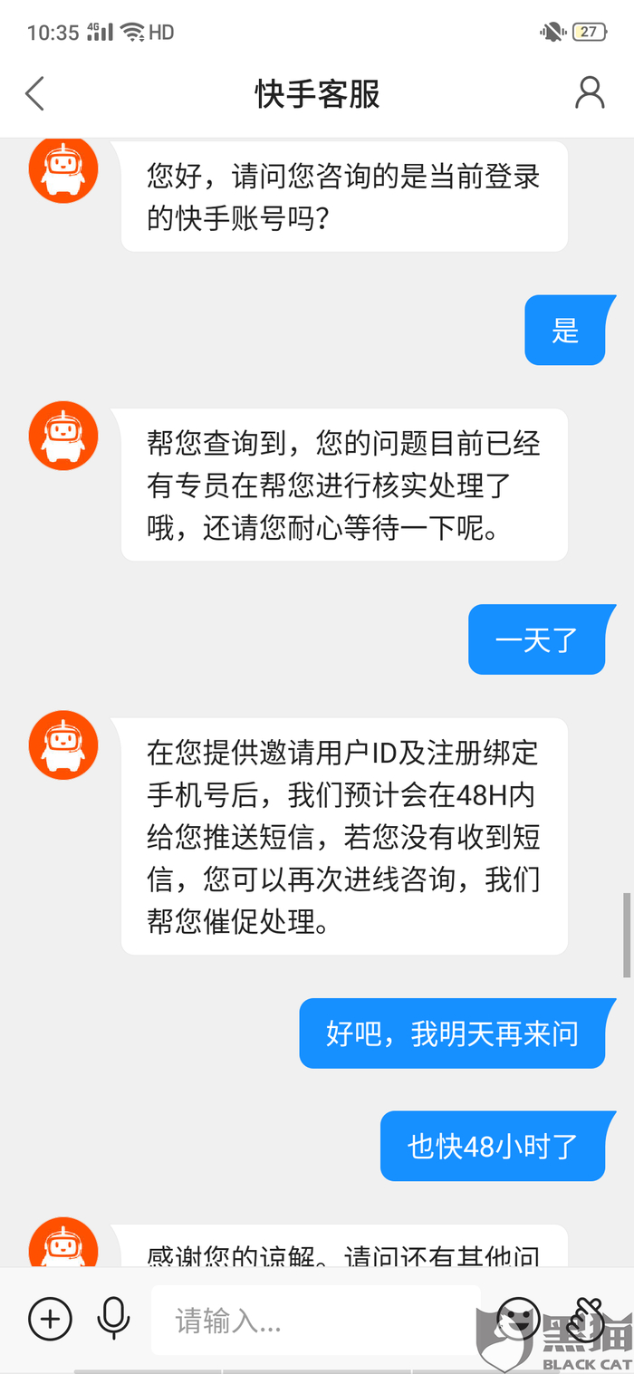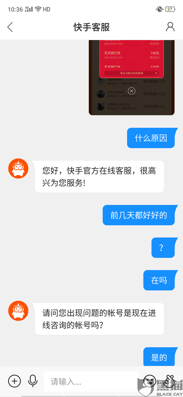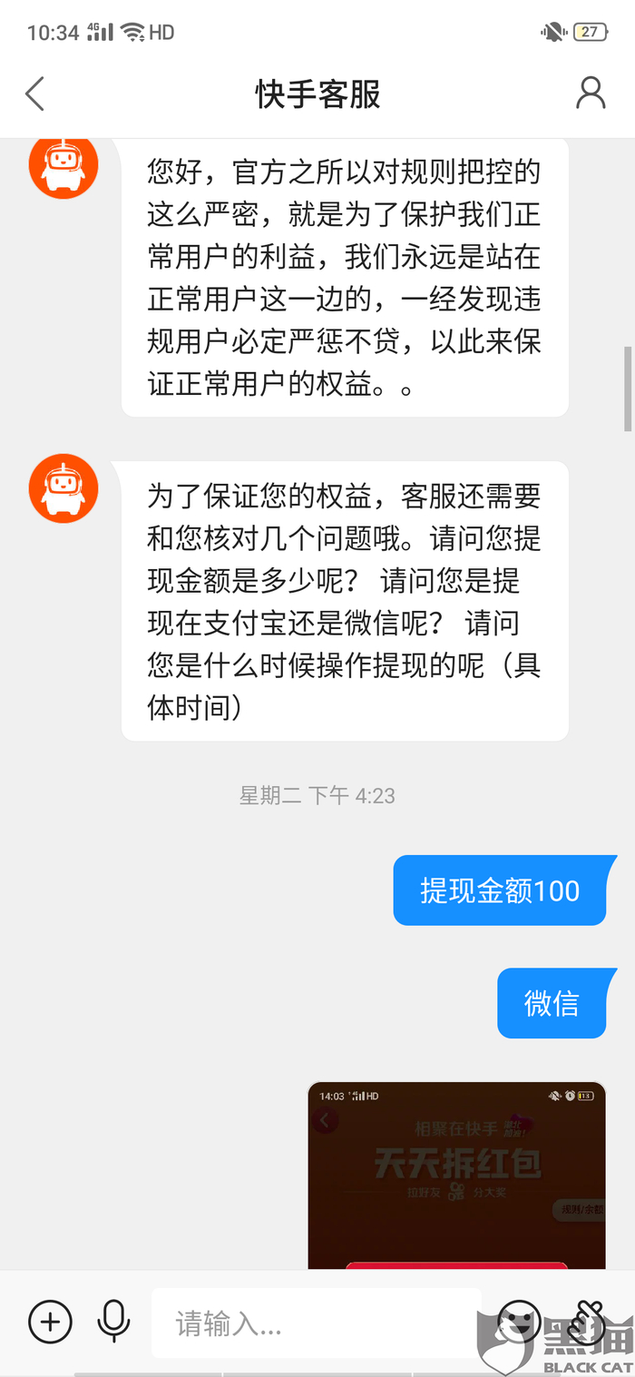 黑猫投诉:快手天天拆红包提现不了,官方不给解释,说48小时之内处理,四天都没有处理,