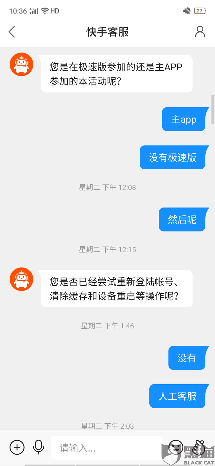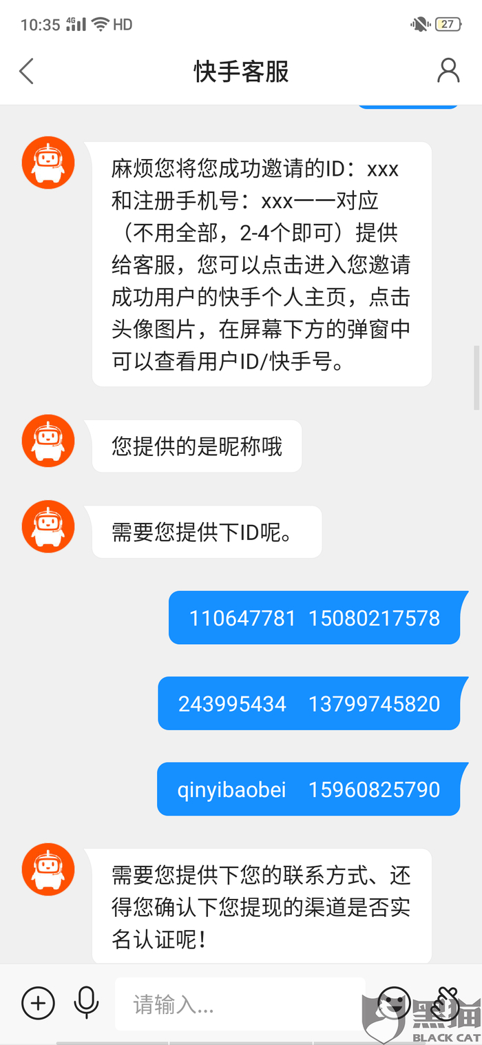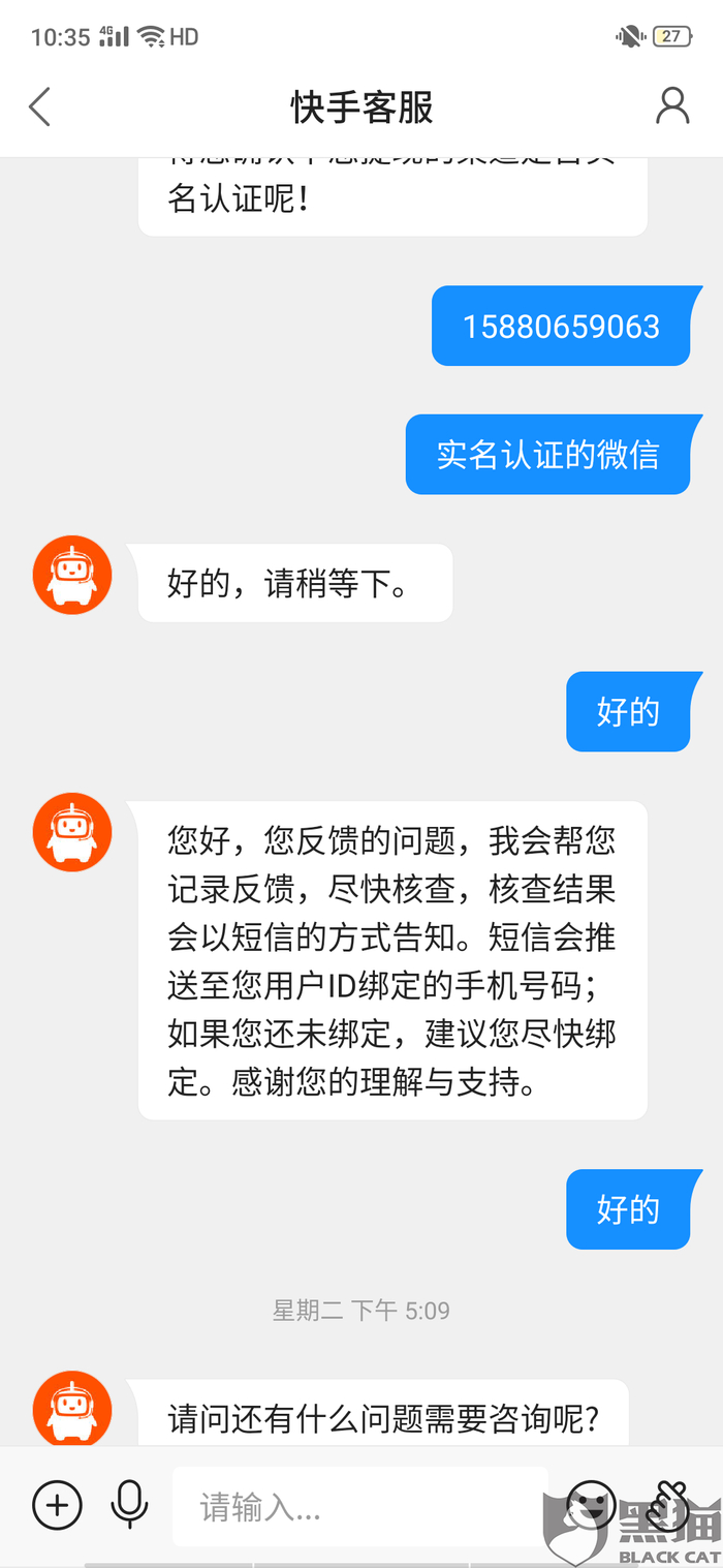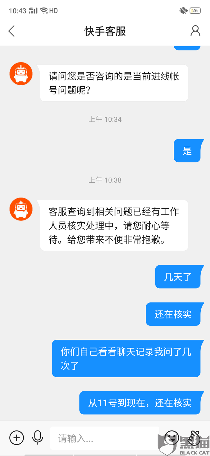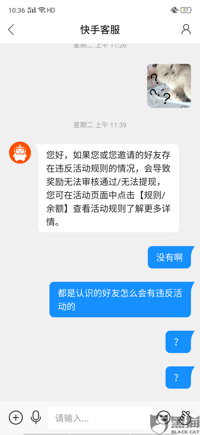 黑猫投诉:快手天天拆红包提现不了,官方不给解释,说48小时之内处理,四天都没有处理,