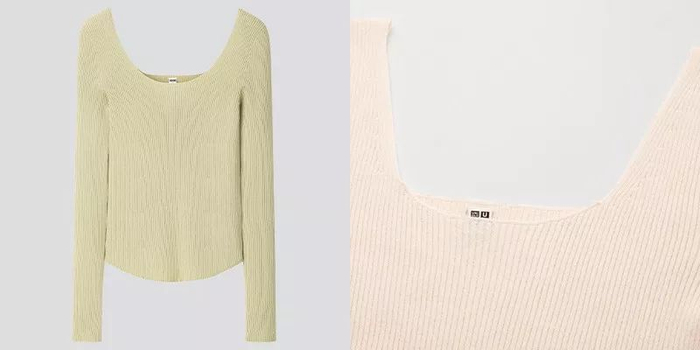 除了BLOCKTECH ,还有 3D Knit 立体针织技术。这一季的 U 首次运用这个工艺制造了低领款式,前后领口都比较低的款式需要更加贴身。 3D Knit 立体针织技术可由编织机一次性编制完成,完全没有针脚,出来的效果更加贴合身体曲线。