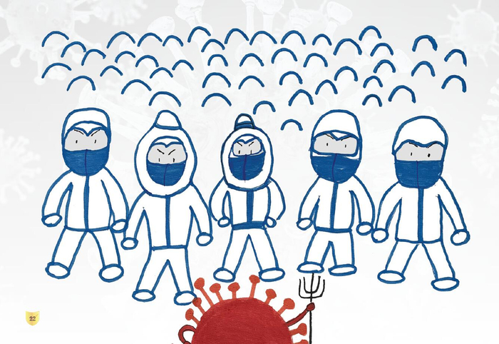 在孩子天真澄澈的眼中,病毒似乎都没那么可怕,更像一个“自以为是的捣蛋鬼”,最终被人类打败,灰头土脸地逃回了家。