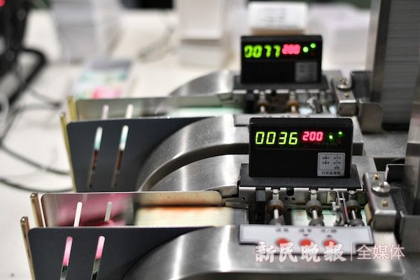“洗完澡”,到了排队入库的时间,也就是第三步“清点、装箱”。神似点钞机的点卡机,每次可清点200张,每400张装一小盒,10盒装一箱。一个人操作机器数完4000张,约半小时。