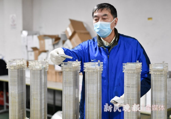 图说:工作人员将卡片放入清洗机 新民晚报记者 陈梦泽 摄(下同)