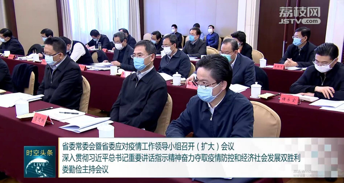 澎湃新闻(www.thepaper.cn)记者注意到,2月17日晚间播出的《江苏新时空》,有关江苏省委常委会暨省委应对疫情工作领导小组召开(扩大)会议的报道画面显示,镇江市委书记惠建林和多名江苏省政府领导同排就座,其右侧为江苏省副省长赵世勇,左手边是江苏省政府秘书长、党组成员陈建刚。