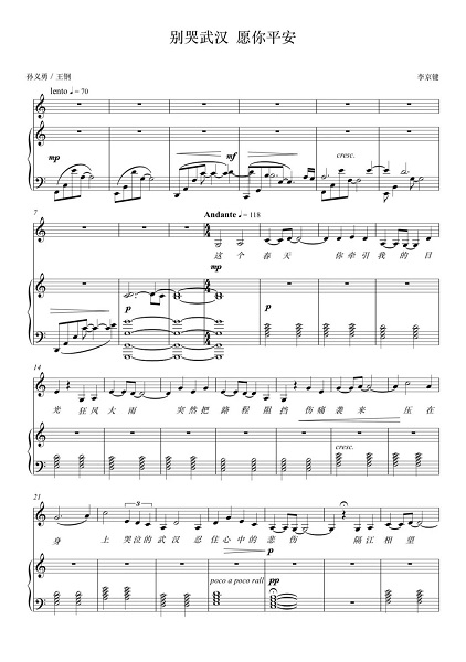 声乐作品《别哭武汉愿你平安》是继《他是最“平凡”》后,由上海大学音乐学院推出的第二首原创抗疫歌曲。作品由上海大学音乐学院作曲专业教师李京键作曲,孙义勇\王钢作词,邹畅演唱。