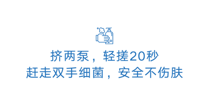 搭完公交、摸了门把手、与陌生人肢体接触后,只需轻按两泵,挤在手心双手搓够20秒,直到泡沫全部干掉即可,也防止毛巾、纸巾擦手的二次感染。