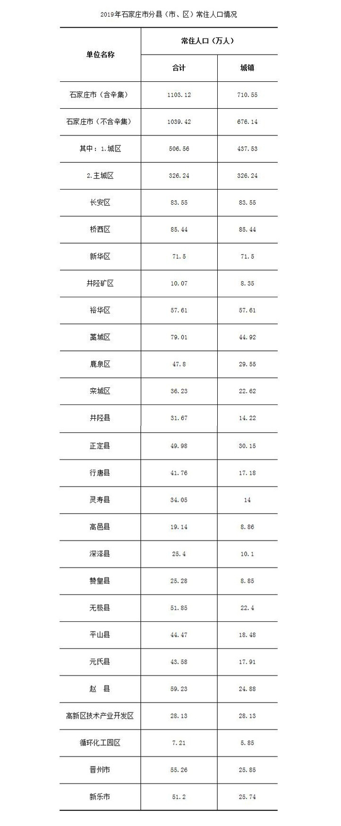 注:1.城区常住人口,包括长安区、桥西区、新华区、井陉矿区、裕华区、藁城区、鹿泉区、栾城区、石家庄高新技术产业开发区、石家庄循环化工园区共10个区的常住人口;