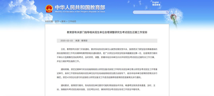 原定4月初左右进行的全国硕士研究生复试工作是否延期将视疫情防控进展情况另行通知。