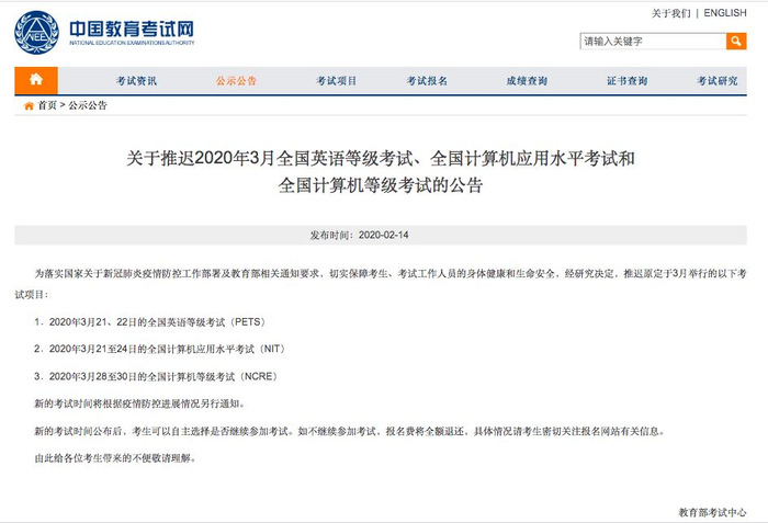 近日,教育部考试中心发布《关于推迟2020年3月全国英语等级考试、全国计算机应用水平考试和全国计算机等级考试的公告》。