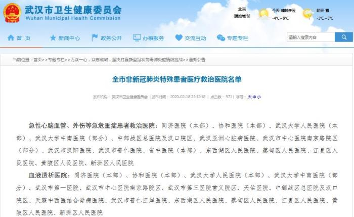 武汉公布全市非新冠肺炎特殊患者医疗救治医院名单