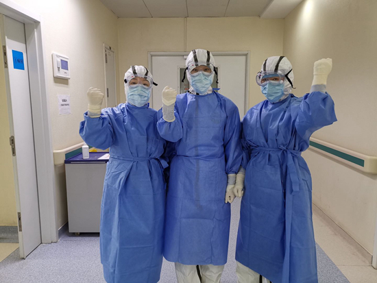 北京支援湖北医疗队的3名年轻护士徐亦敏、刘宇航、刘英,在进隔离病区前为自己加油。