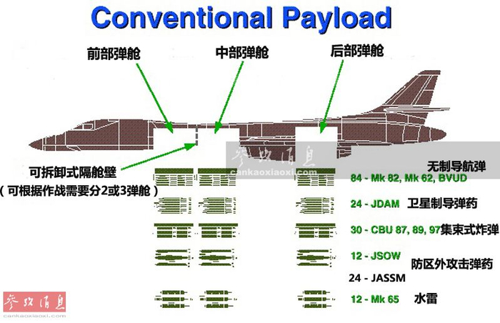 B-1B“枪骑兵”是美军现役武库中,载弹量最大的轰炸机, 图为B-1B的弹舱挂载配置示意图,该型机共有3个弹舱(其中前部的两个弹舱可根据需要合二为一,搭载重型炸弹),内部载弹量达到34吨,可搭载美空军武库中几乎所有的弹药,从自由落体核弹、核巡航导弹到常规航弹,卫星制导弹药,甚至反舰导弹、水雷均可囊括。