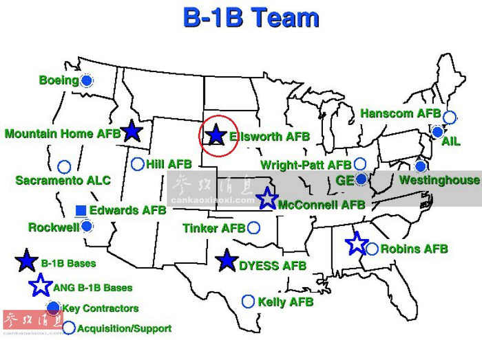第28轰炸机联队同时也是美空军仅有的两个B-1B轰炸机联队之一,另一支为驻扎在德克萨斯州的戴亚斯空军基地的第7轰炸机联队。这张美国本土B-1B驻地分布图上,用红圈标出的就是第28联队的驻地。