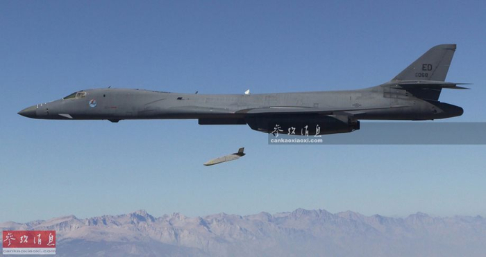 4月14日,该联队的2架B-1B从位于中东卡塔尔的乌代德基地起飞,发射了19枚JASSM-ER隐身巡航导弹。图为B-1B投放AGM-158隐身巡航导弹资料图。