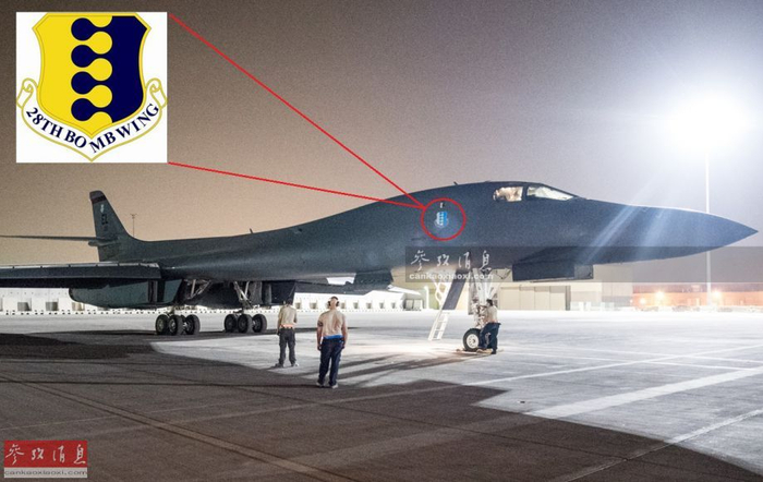 从公开的这张现场图,可以看到参战的这2架B-1B轰炸机机身上,标有美空军第28轰炸机联队的徽标(左上为徽标大图),该联队隶属于美空军第8航空队,最初组建于1948年,联队绰号“北方守护者”,自冷战至今一直是美空军战略威慑力量的主力部队之一。
