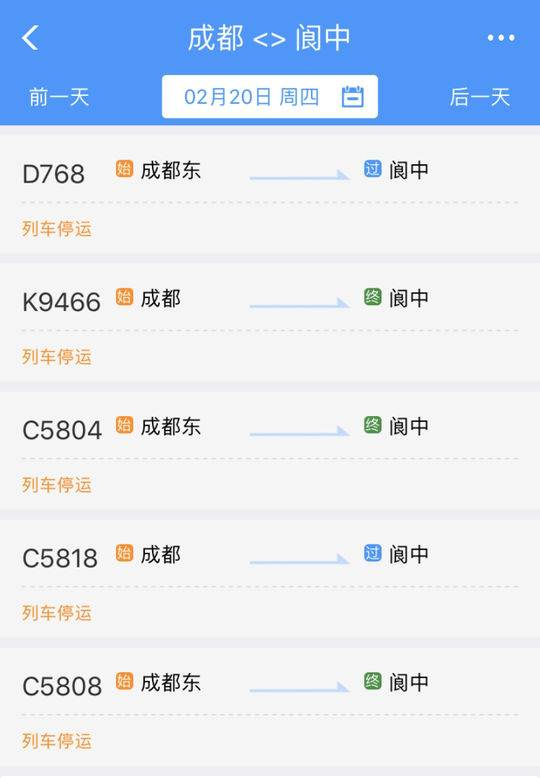2月19日起 四川阆中至成都方向的火车全部停运