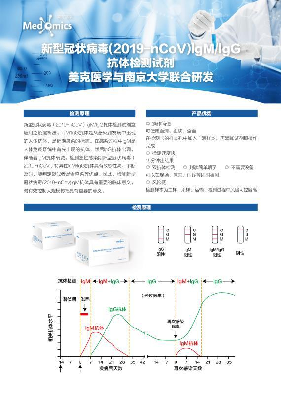 由南京大学与美克医学联合研制成功的新型冠状病毒(2019-nCoV)lgM/lgG抗体检测试剂盒应用了免疫层析法。lgM/lgG抗体是从感染到发病中出现的人体抗体,是近期感染的标志。在感染过程中lgM是人体免疫系统中首先出现的抗体,然后lgG抗体出现,伴随着lgM抗体衰减。检测急性感染期新型冠状病毒(2019-nCoV)特异性lgM/lgG抗体具有敏感性高、诊断及时、能判定疑似者是否感染等优点。因此,检测新型冠状病毒(2019-nCov)lgM抗体具有重要的临床意义,对有效控制大规模传播具有重要的意义。