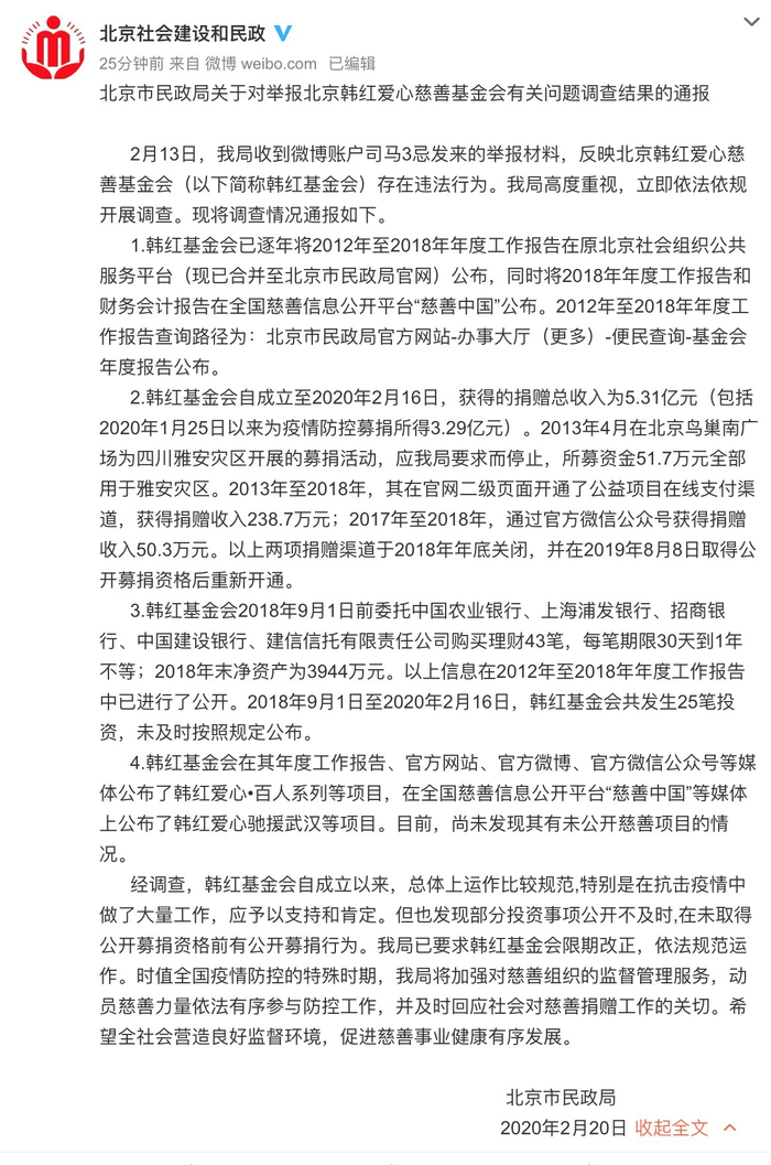 2月20日晚间,北京市民政局在其官方微博就“韩红慈善基金会被举报”事件作出回应,其发布通告称,经调查,韩红基金会自成立以来,总体上运作比较规范,特别是在抗击疫情中做了大量工作,应予以支持和肯定。但也发现部分投资事项公开不及时,在未取得公开募捐资格前有公开募捐行为。已要求韩红基金会限期改正,依法规范运作。
