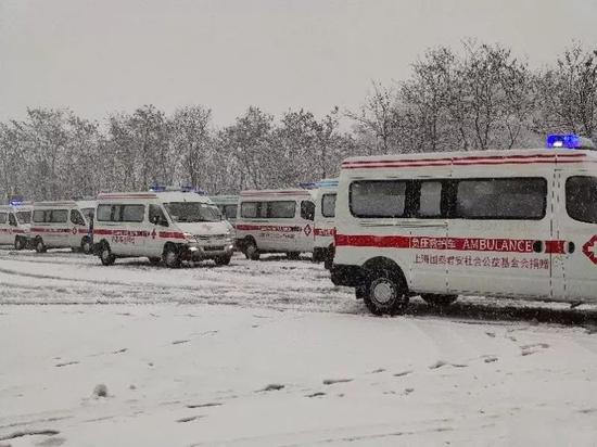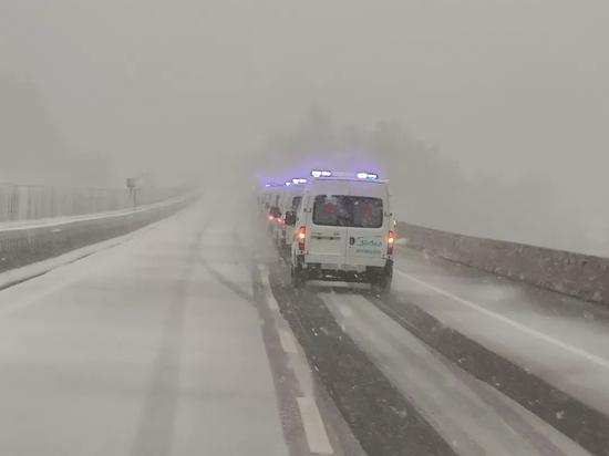 好在到了下午雪就开始慢慢变小了,五点多的时候,离交接地点只剩近百公里的距离,可以在预计的时间到达武汉,大家稍稍松了一口气。五点多的冬夜天色早就暗了下去,如果这时有人能从高空往下看,就会看到救护车车灯连成一线,就像一条充满温暖与热情的火龙,向着武汉的方向奔腾。