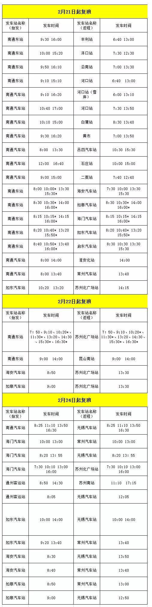 2月22日起,苏州至南通、东台、海安、如皋等班线恢复营运;