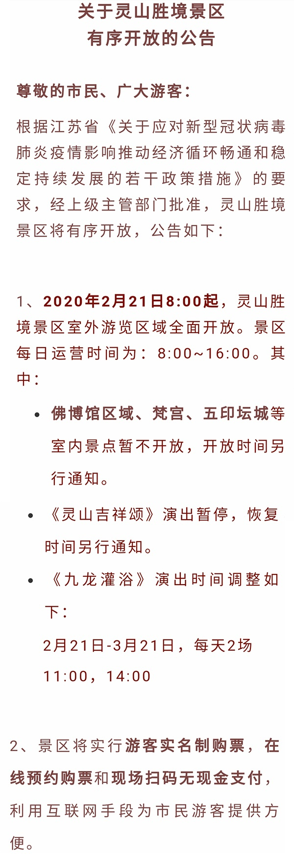 2月20日,无锡灵山胜境在微信公众号发布将有序开放的公告,自2020年2月21日8:00起,灵山胜境景区室外游览区域全面开放,每日运营时间为8:00至16:00。此外,为避免面对面接触,景区实行实名制在线预约购票和现场扫码无现金支付的方式。门票购买渠道有灵山胜境官方公众号、灵山胜境官网,灵山大佛天猫旗舰店,携程网、同程网等。