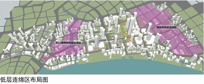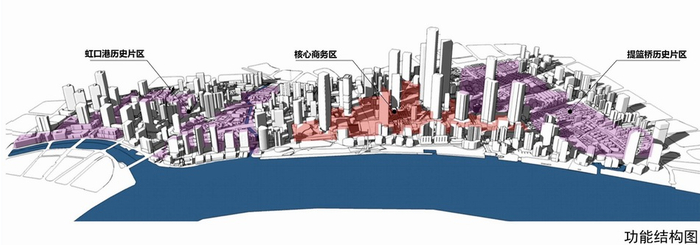 虹口港片区打造为滨水生态娱乐区,延续里弄空间特色,注入餐饮、休闲、娱乐等功能。