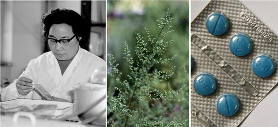 中国中医科学院首席研究员屠呦呦率先从大量中医古籍中筛选出青蒿作为抗疟首选药物并发现青蒿有效部位乙醚提取物,让中国医药拯救了全世界数百万人的生命,她于2015年获得诺贝尔生理学或医学奖。图为屠呦呦、青蒿和抗疟疾成药。(资料照片)