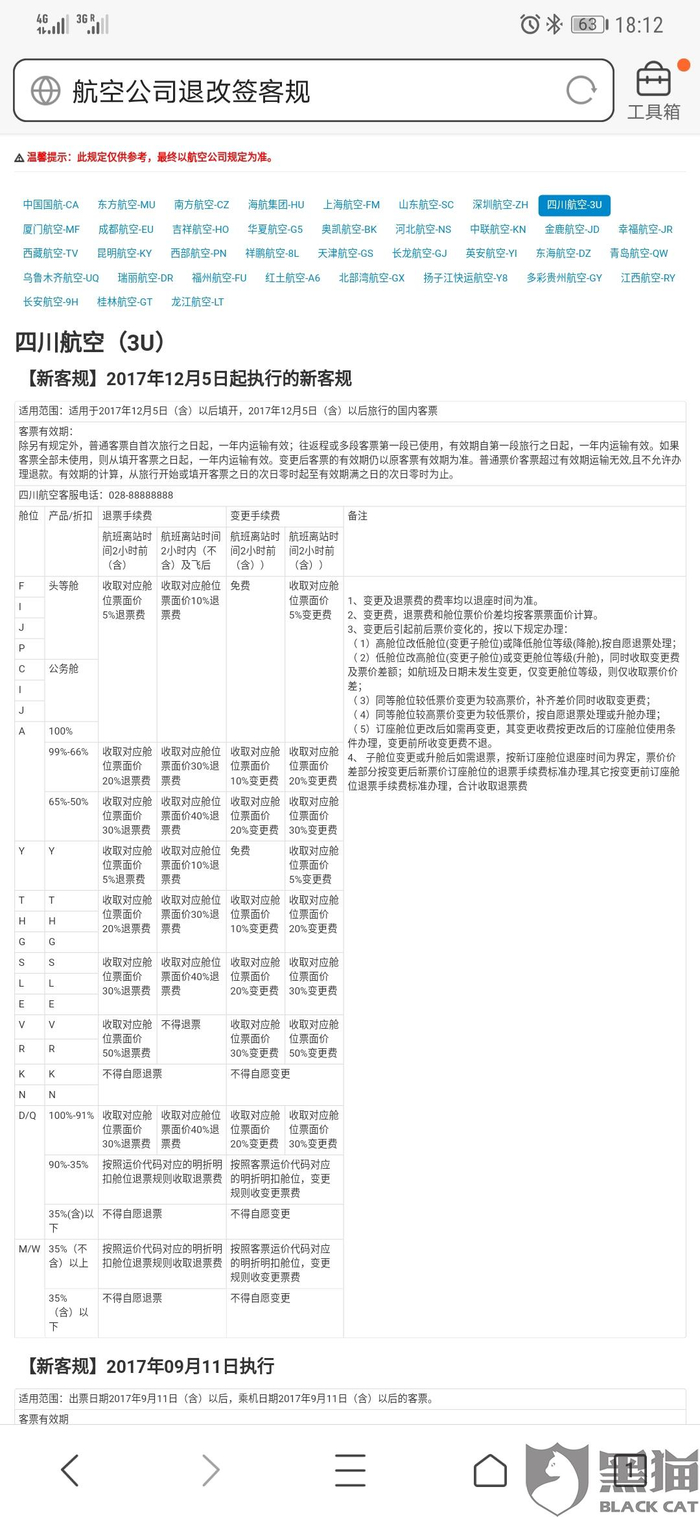 消费者“乌苏桥边_660_763”在2月24日向黑猫投诉平台再次反映:“根据川航改退规定,备注第四条,升舱后退票,票额差部分按照新票额退改规定执行。因为我的机票是航班取消,先要求他们全款退差额有问题吗?现在去哪儿客服回复就是川航客服回复退不了,那么是以川航客服为准还是以川航的规定为准?”