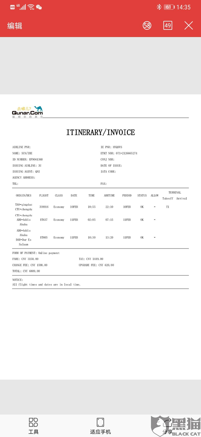 黑猫投诉:航班取消,之前改签收取的升舱费不退