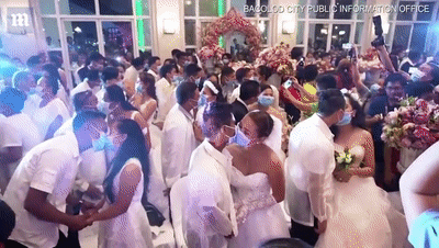 220对新人举行集体婚礼 全戴口罩交换誓言和接吻