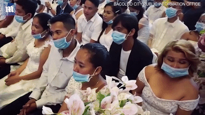 这场别样的集体婚礼是20号在巴科洛德市政厅举行的,现场有220对新人穿着礼服和婚纱完成了神圣的结婚仪式。他们全都戴着口罩交换了誓言并互相亲吻。