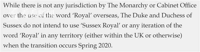 在21日晚发布的超长网站声明中,哈里和梅根将矛头对准了女王,他们宣布将从3月底起放弃“苏塞克斯王室”这一品牌,但同时指出女王和英国政府并不拥有任何人在海外使用这个词的管辖权。