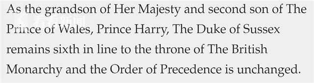 声明中明确,哈里还将保留他的军事职务,包括少校军衔、中尉指挥官等等的荣誉军衔。