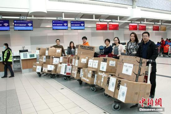 资料图:当地时间2月15日,复旦大学多伦多校友会及多伦多当地华侨华人捐赠的一批防护服、护目镜等医用防护物资在多伦多国际机场办妥上机手续,将发往武汉、上海等地。新冠肺炎疫情发生以来,加拿大各地华侨华人持续以捐款捐物等各种方式、通过各种渠道积极支持祖(籍)国和家乡抗疫。航空公司为这些救援物资开通了运输绿色通道。 中新社记者 余瑞冬 摄
