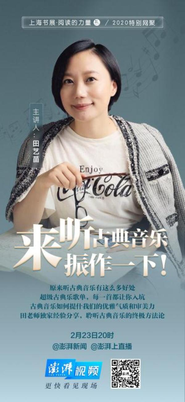 2月23日晚8点,上海音乐学院副教授田艺苗,将与网友分享古典音乐的美。原来听古典音乐有这么多好处;超级古典乐歌单,每一首都让你入坑;古典音乐如何提什我们的优雅气质和审美力;田艺苗老师独家经验分享,聆听古典音乐的终极方法论。
