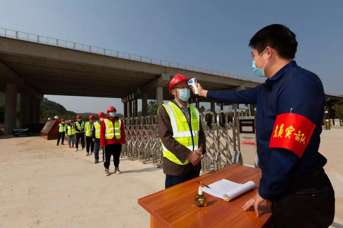 2月20日上午,紫惠高速路面水稳拌合站工地现场,“滴,36.5度!”一声响亮的测温仪报数声,吹响了紫惠项目复工的号角。几十名佩戴口罩和安全帽的工人排着队依次通过检测点,体温检测、登记、消毒,经过严格的“三道关”才能进入工地。