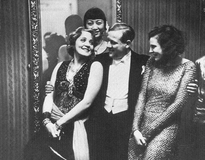 玛琳·黛德丽、黄柳霜、莱尼·里芬斯塔尔与一名不知名男子于柏林化妆舞会,拍摄于1928年。