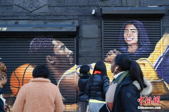 当地时间2月8日,美国纽约巴克莱体育中心外,人们纷纷在一幅新的悼念科比主题的涂鸦前驻足。1月26日,科比·布莱恩特的私人直升机在美国加州小城卡拉巴萨斯坠毁,包括科比及其二女儿在内的机上9人全部遇难。中新社记者 廖攀 摄