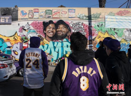 当地时间1月28日,球迷们来到洛杉矶一处绘有科比·布莱恩特及其二女儿吉安娜的壁画前寄托哀思。坠机事件发生后,洛杉矶多处与科比有关的场所都出现不少球迷,这一幅灾难发生后出现的壁画,也成为球迷们寄托哀思的载体。 中新社记者 刘关关 摄