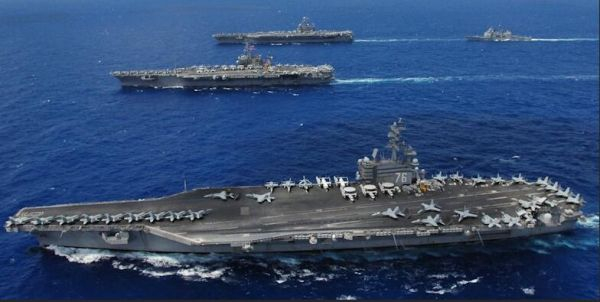 资料图片:美海军三航母编队航行演练。(美海军官网)