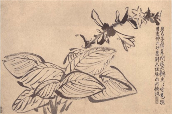 说明:(明)徐渭,《十六种花卉图》(局部),藏于北京故宫博物院。此画作于万历五年(1577年)。画面题诗:“老夫墨扫草间秋,六瓣尖尖雪色流。用尽邢州沙万斛,未便琢出此搔头。”